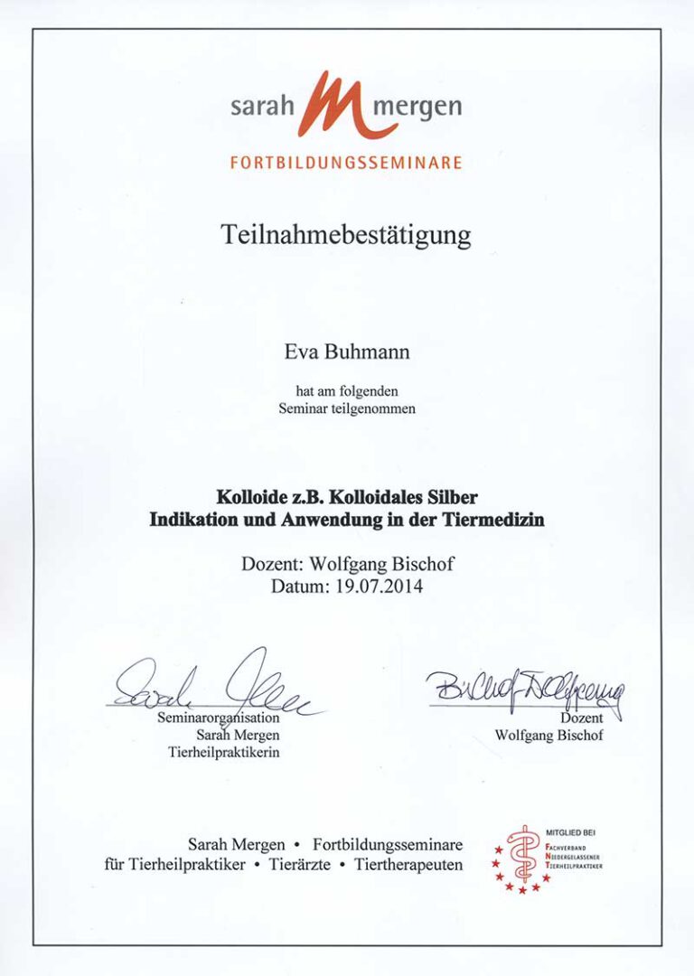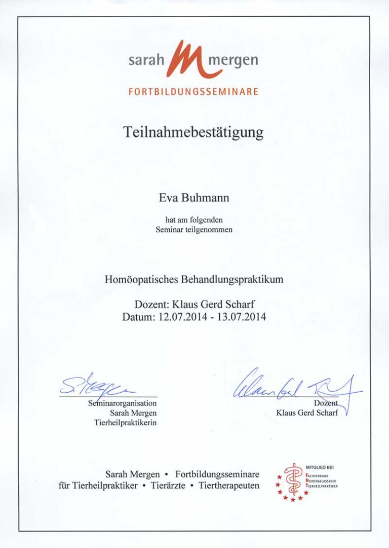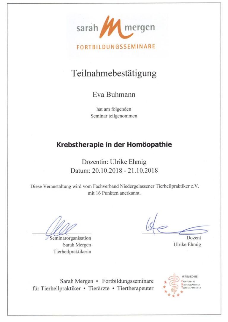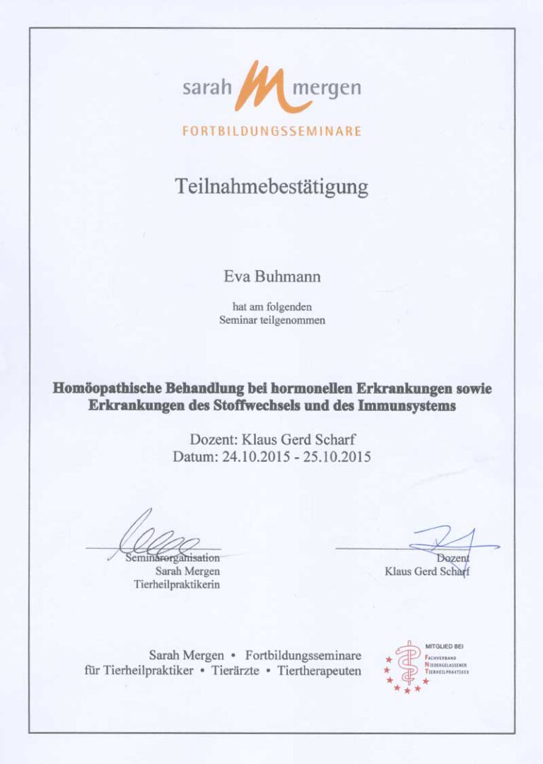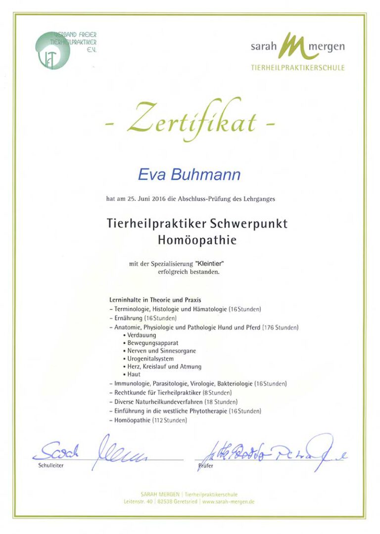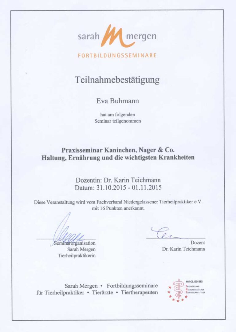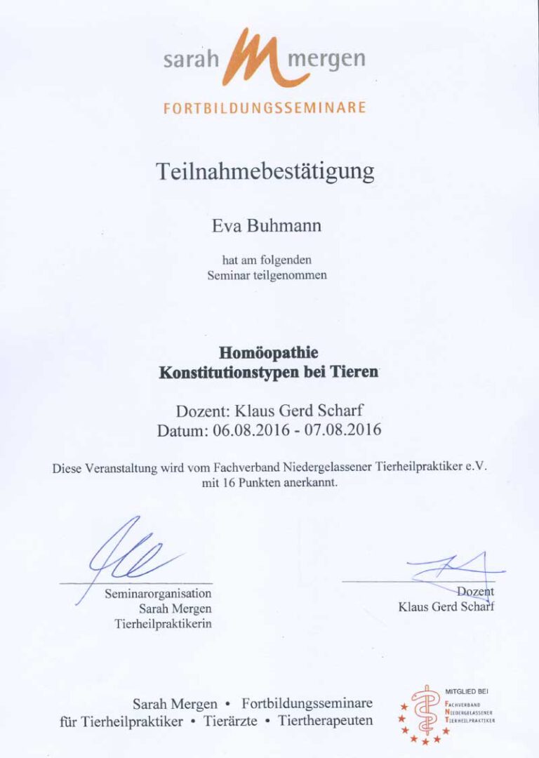 My name is Eva Buhmann. I am a Tierheilpraktikerin. For many years I have been learning about nutrition and various naturopathic methods, particulary homeopathy. I have qualifications in animal communication and sound therapy. My goal is to combine these abilities. Each animal is unique in its nature, character, life story and history of disease. Because of this I take the time to do the anamnesis and decide on an individual therapy pathway.
