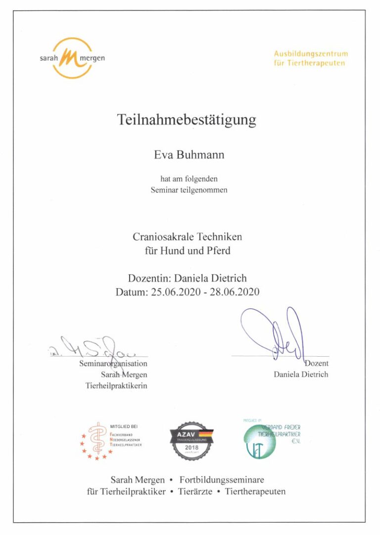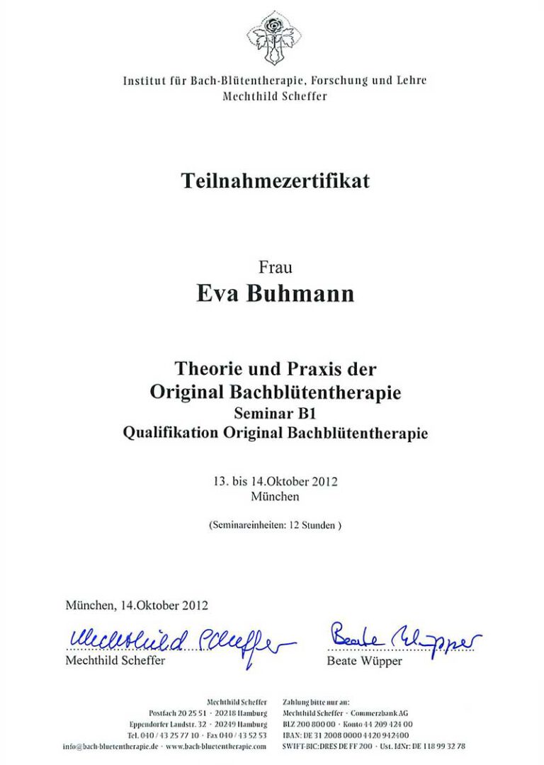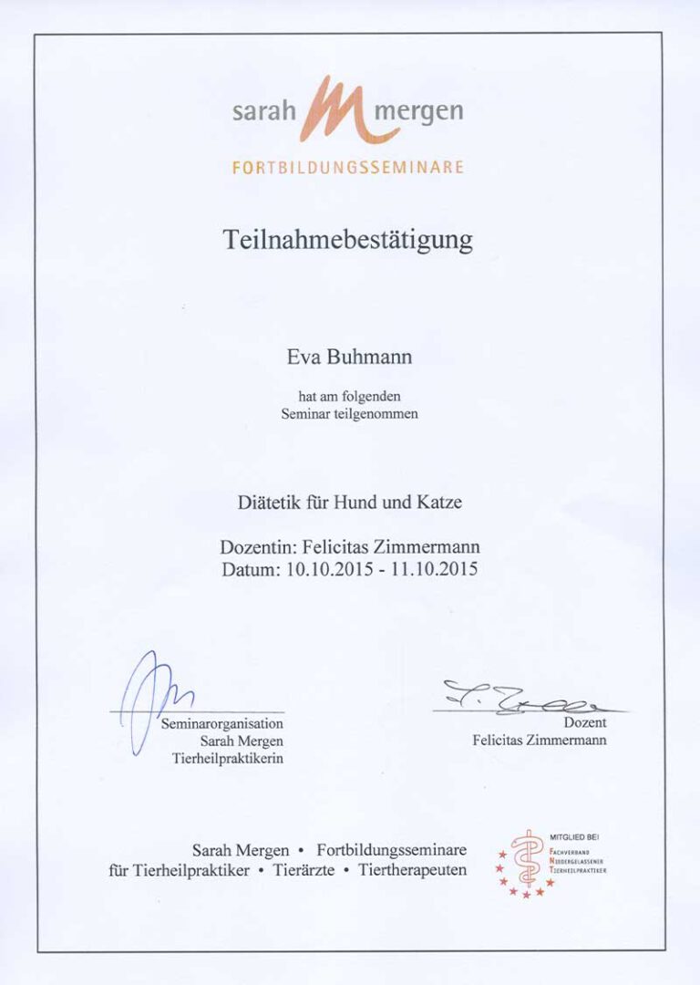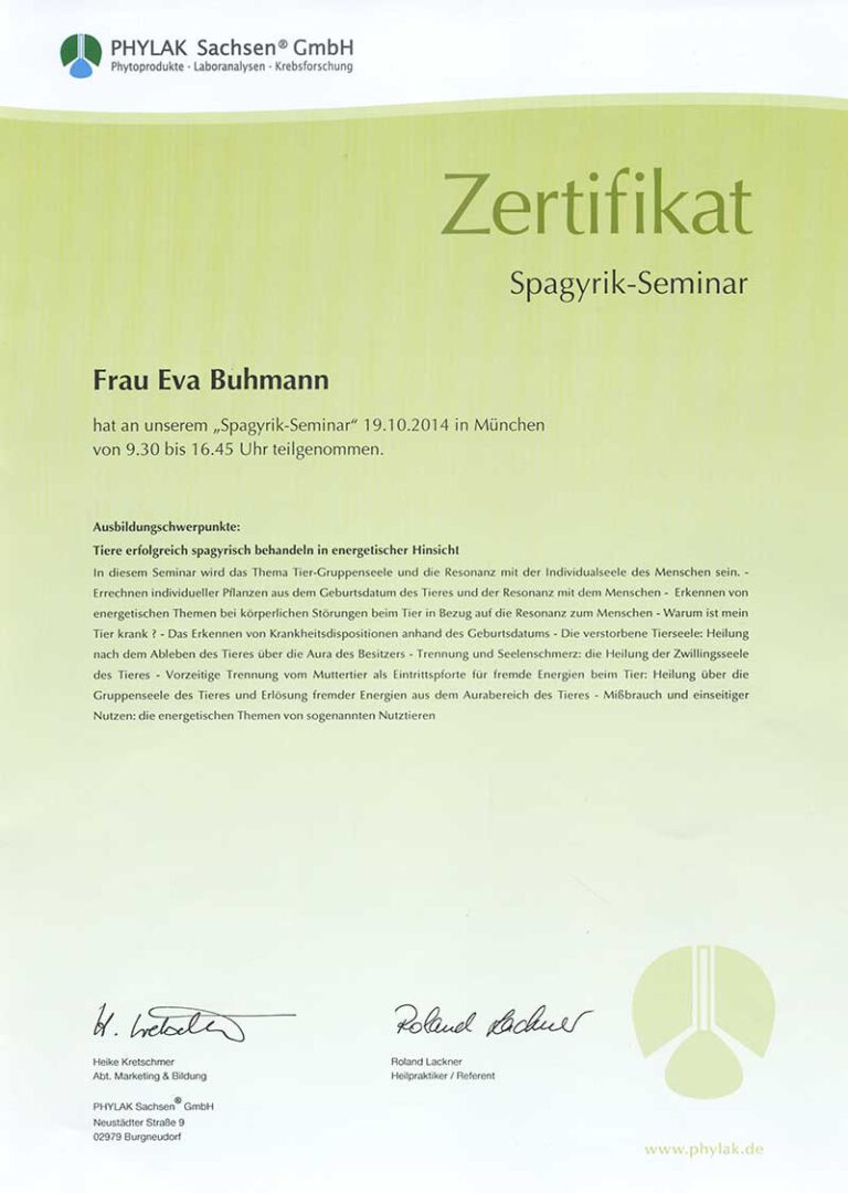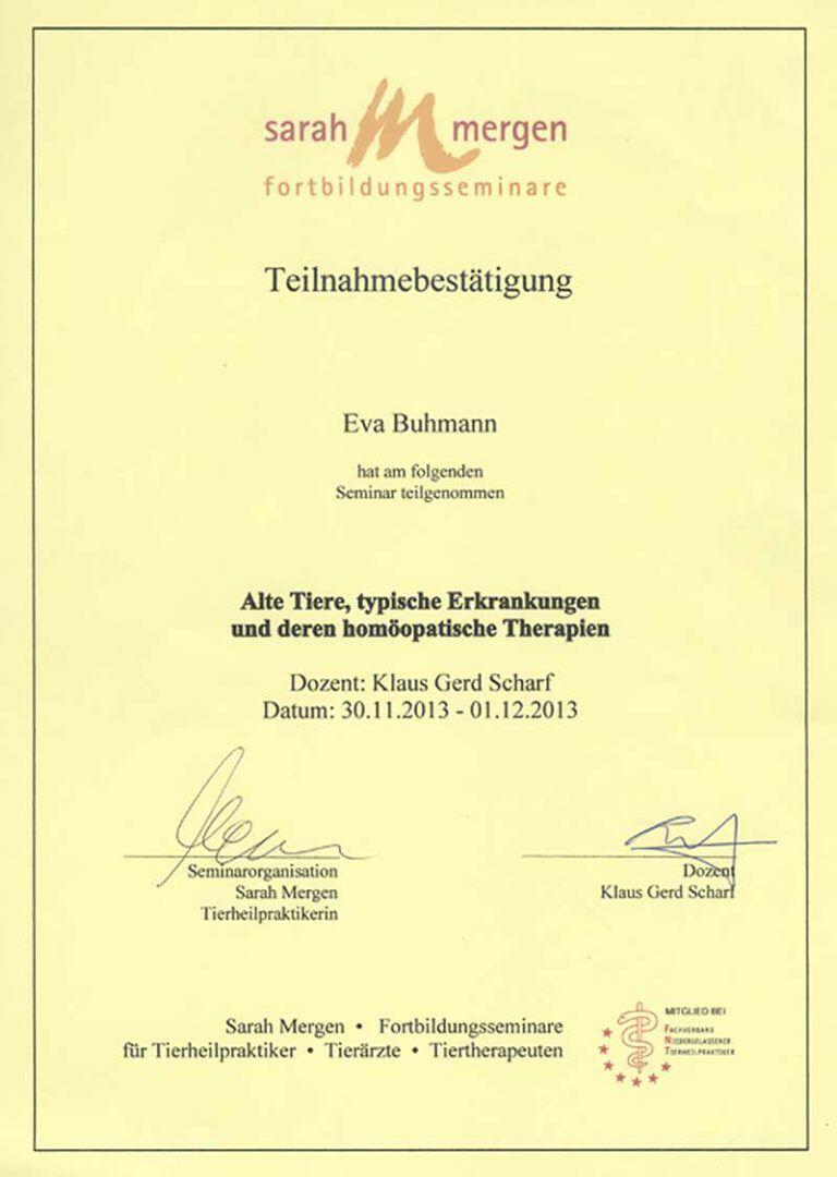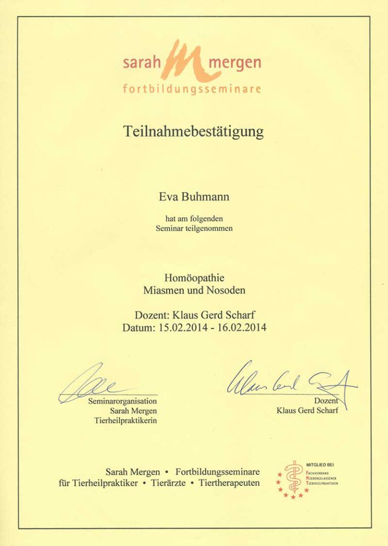 My name is Eva Buhmann. I am a Tierheilpraktikerin. For many years I have been learning about nutrition and various naturopathic methods, particulary homeopathy. I have qualifications in animal communication and sound therapy. My goal is to combine these abilities. Each animal is unique in its nature, character, life story and history of disease. Because of this I take the time to do the anamnesis and decide on an individual therapy pathway.