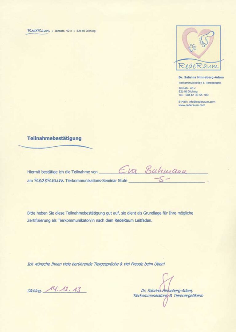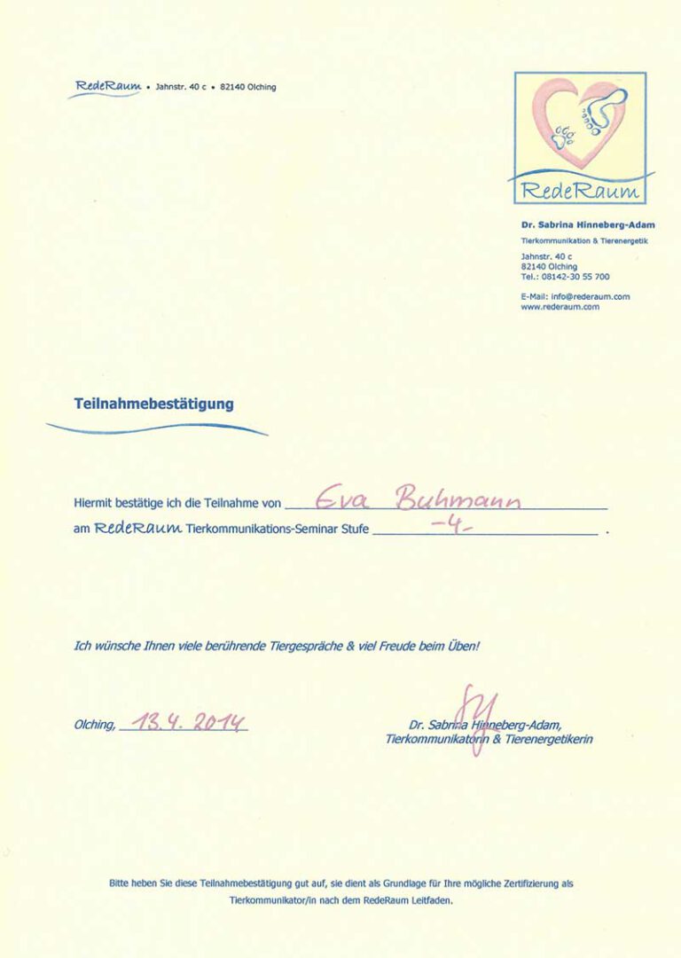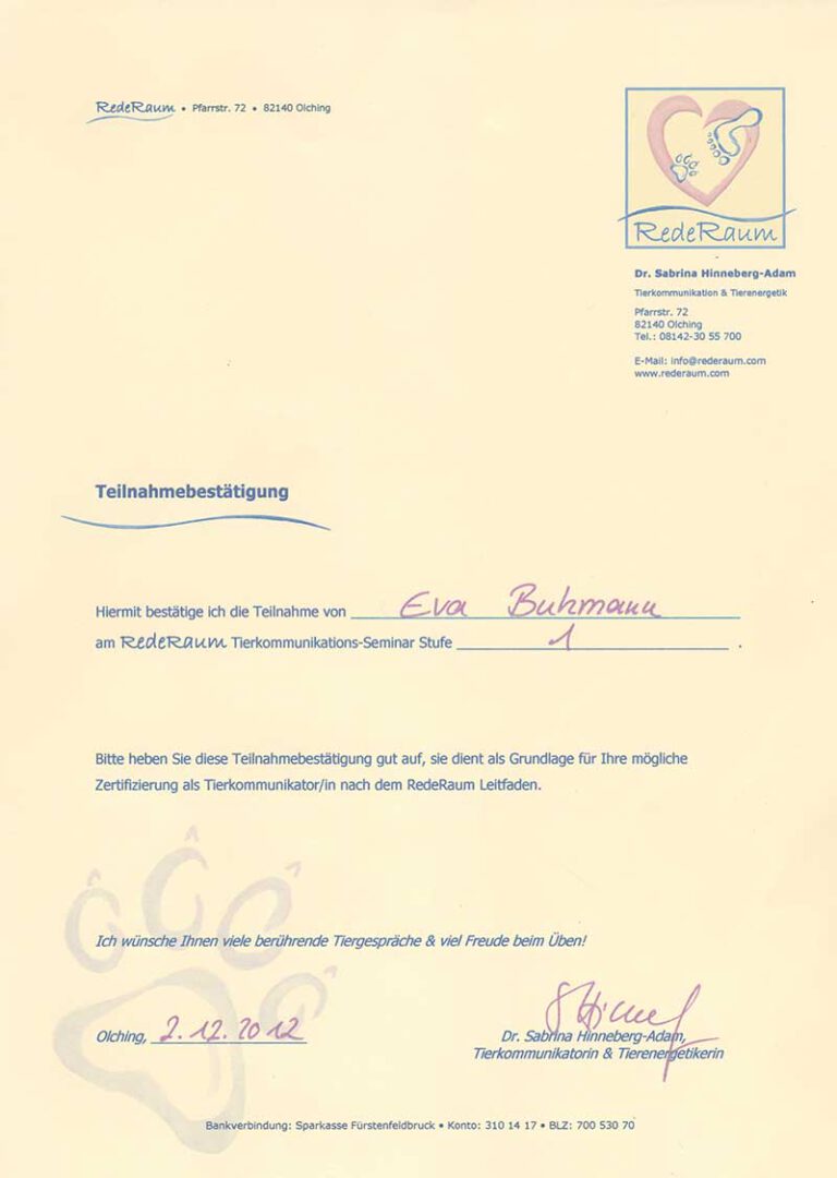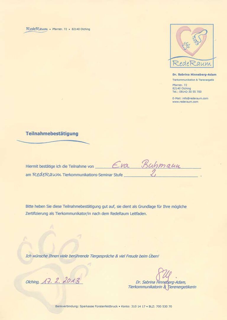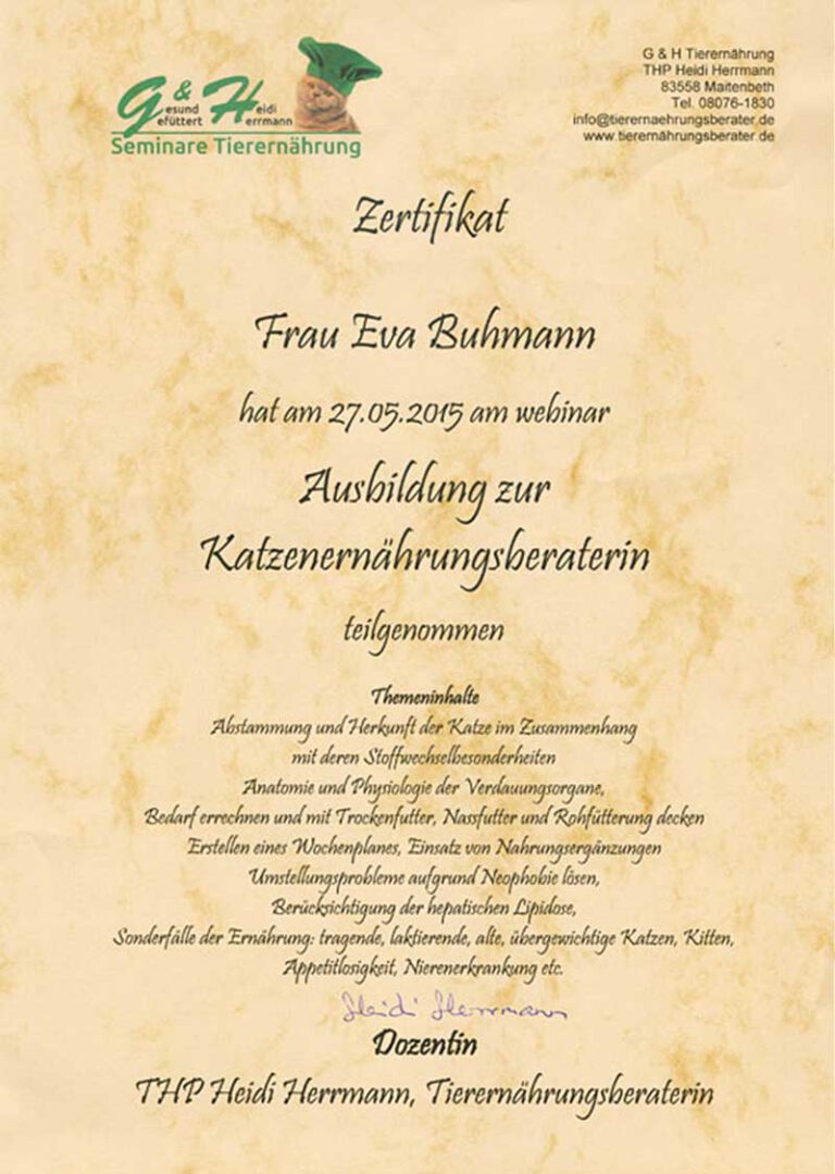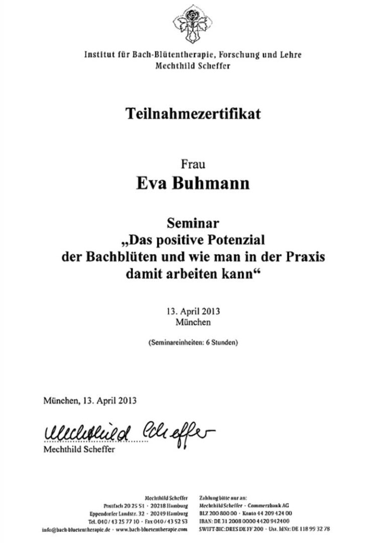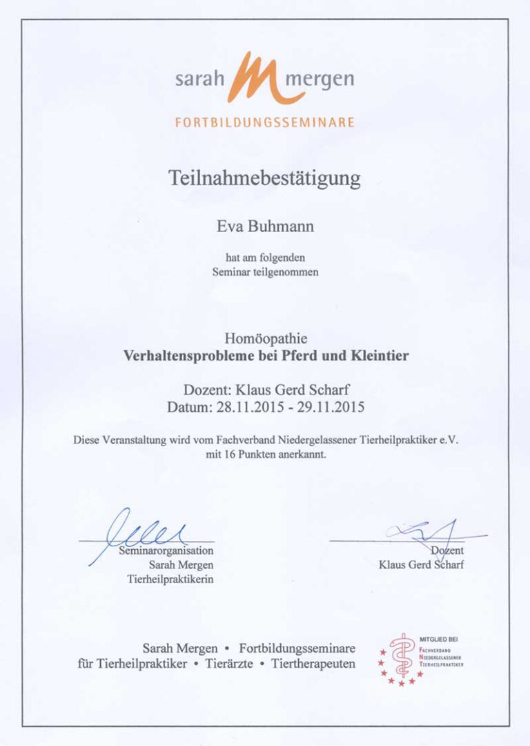 My name is Eva Buhmann. I am a Tierheilpraktikerin. For many years I have been learning about nutrition and various naturopathic methods, particulary homeopathy. I have qualifications in animal communication and sound therapy. My goal is to combine these abilities. Each animal is unique in its nature, character, life story and history of disease. Because of this I take the time to do the anamnesis and decide on an individual therapy pathway.