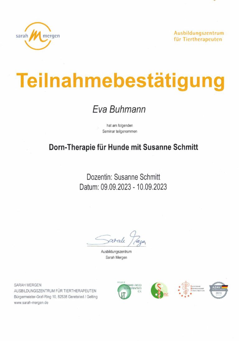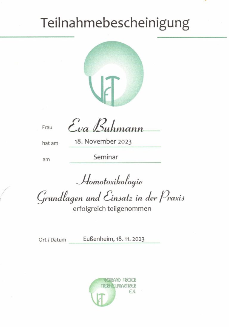 Je m’appelle Eva Buhmann et suis naturopathe pour animaux (Tierheilpraktikerin). Depuis de nombreuses années, je me consacre à l’étude des bienfaits de la nutrition ainsi qu’à différentes méthodes naturopathiques, en particulier l’homéopathie. Je suis qualifiée en communication animale et en thérapie sonore.